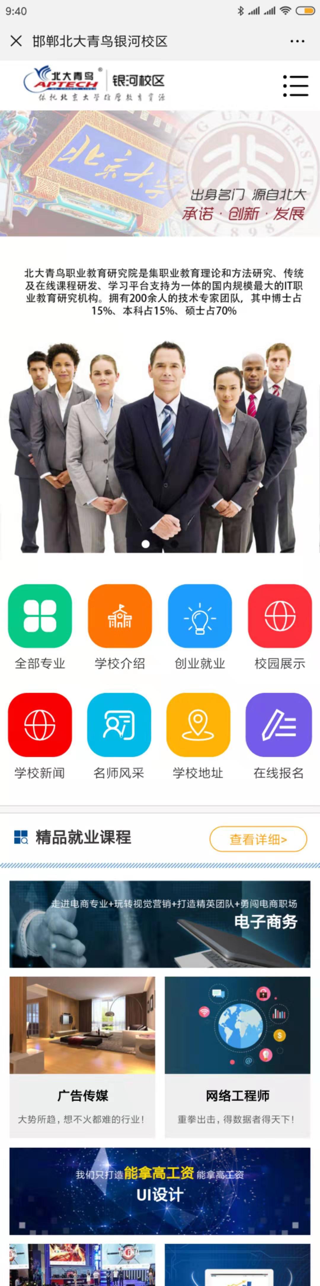 新聞?wù)?邯鄲冀南新區(qū)銀河中等專業(yè)學(xué)校,是北大青鳥總部在邯鄲地區(qū)唯一授權(quán)培訓(xùn)中心:北大青鳥(邯鄲)銀河校區(qū)。學(xué)校位于邯鄲冀南新區(qū)緊鄰邯鄲機(jī)場(chǎng),學(xué)校開設(shè)了啟蒙星、軟件工程、Ui 設(shè)計(jì)、網(wǎng)絡(luò)工程師、游戲動(dòng)漫、廣告?zhèn)髅?、電子商?wù),是邯鄲地區(qū)規(guī)模較大的IT學(xué)校。