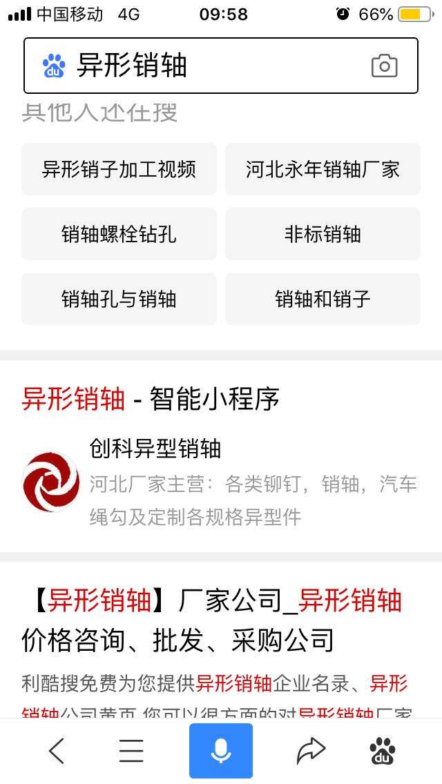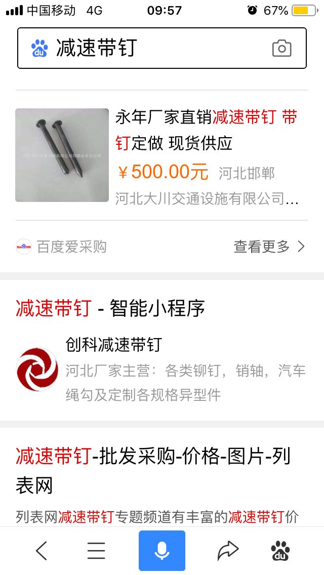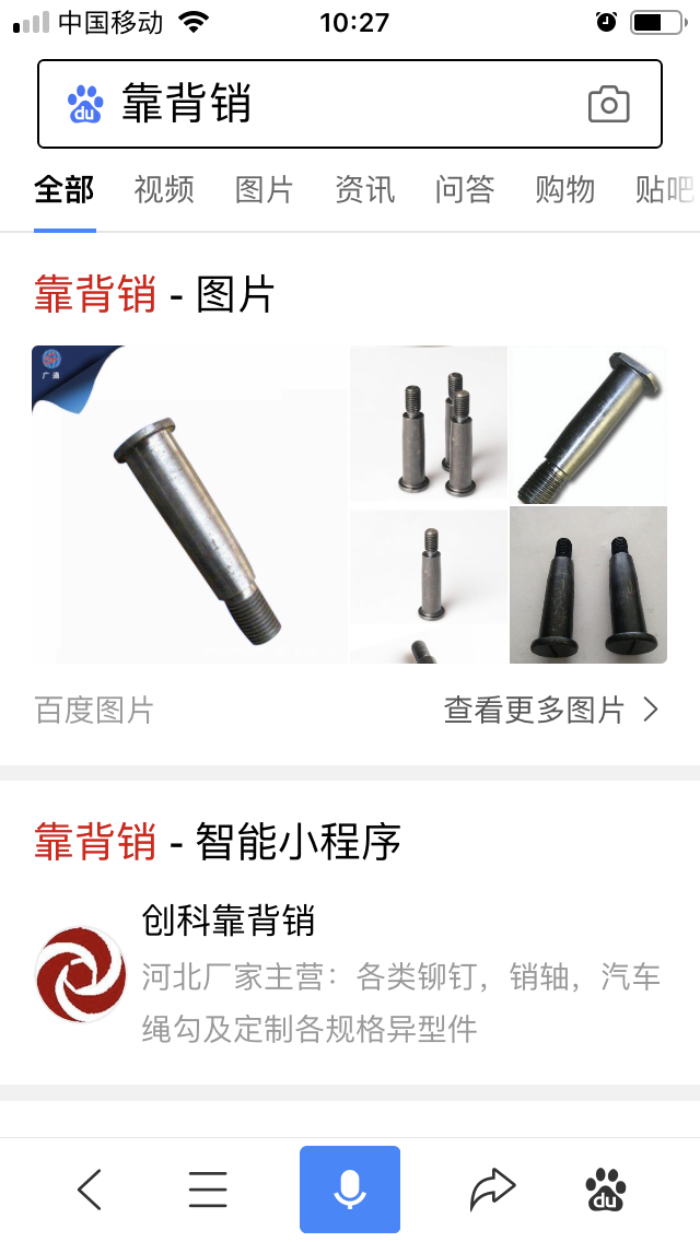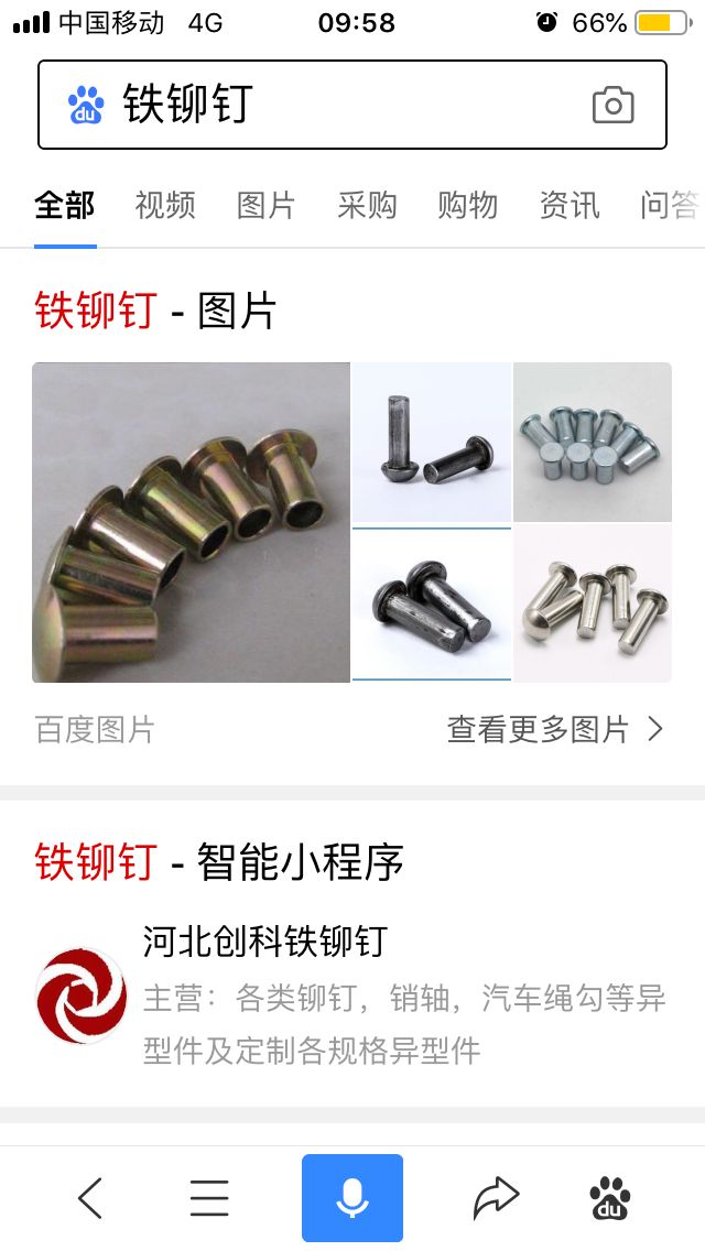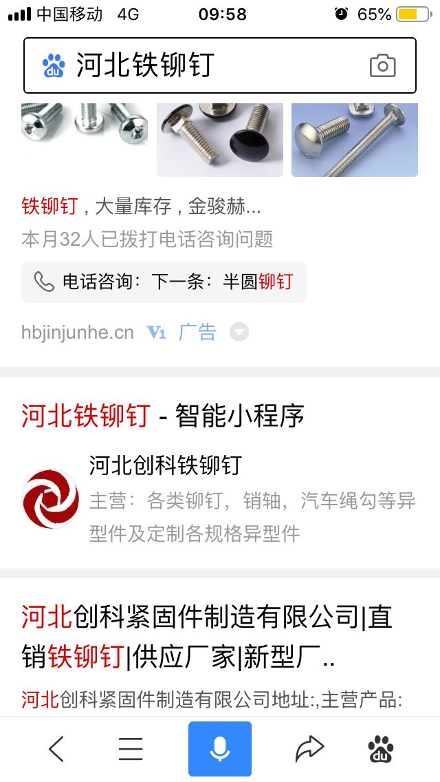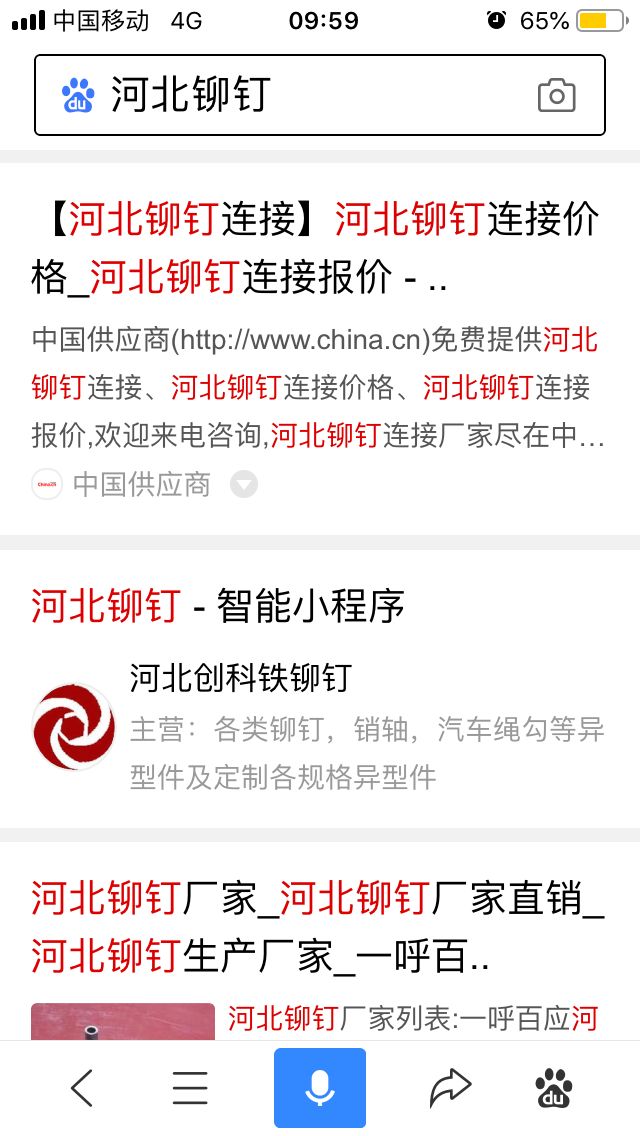 百度小程序:創(chuàng)科鉚釘、河北創(chuàng)科鐵鉚釘、河北創(chuàng)科銷軸、創(chuàng)科汽車?yán)K勾、創(chuàng)科靠背銷、創(chuàng)科減速帶釘、創(chuàng)科平頭鉚釘、創(chuàng)科開口銷、創(chuàng)科異型銷軸